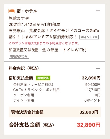 おおだde宿泊キャンペーンは、1人あたり最大4,000円の宿泊割引かキャッシュバック(今回は大人2名)なので、さらに16,000円分旅費が節約できます。